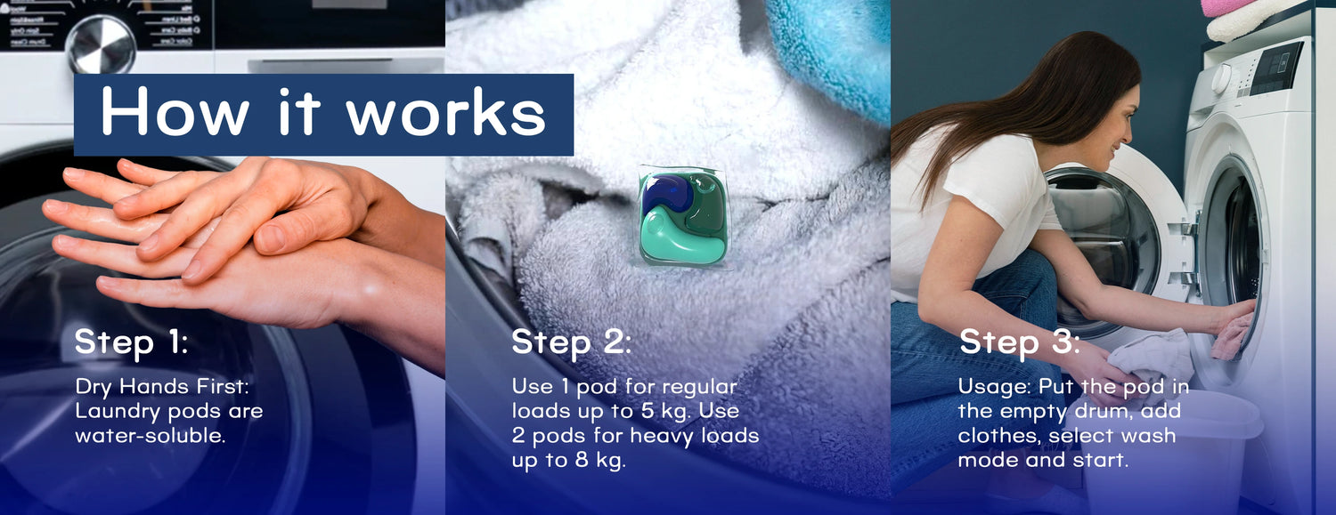 Use one pod for a regular load. For heavily soiled clothes or extra-large loads, use two pods. Always add the pod directly into the drum before adding clothes.